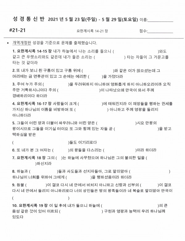 성경통신반 #21-21 작성자 정보 FKUMC 작성 작성일 2021.05.20 00:05 컨텐츠 정보 4,304 조회 목록 답변 본문 성경통신반 문제지 #21-21 입니다. 관련자료 이전 성경통신반 #21-22 작성일 2021.05.26 05:20 다음 성경통신반 #21-20 작성일 2021.05.13 00:59 댓글 0개 등록된 댓글이 없습니다. 목록 답변